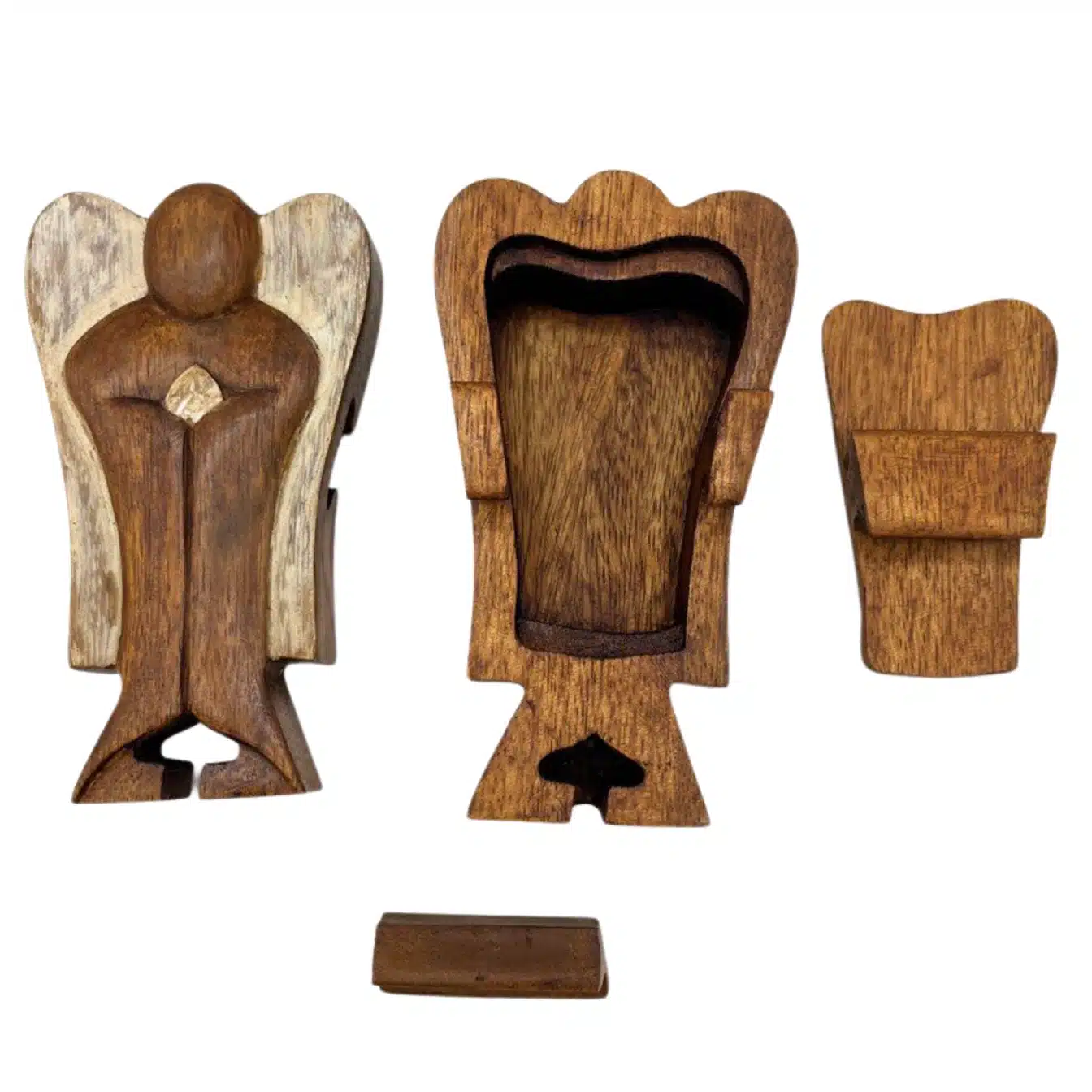En beskyttende engel skåret i varmt træ, som gemmer et lille hemmeligt rum i sit indre. Den symboliserer ro, tryghed og stille nærvær – et helligt sted til dine intentioner, bønner eller små skatte. En smuk påmindelse om, at du altid er holdt og guidet.