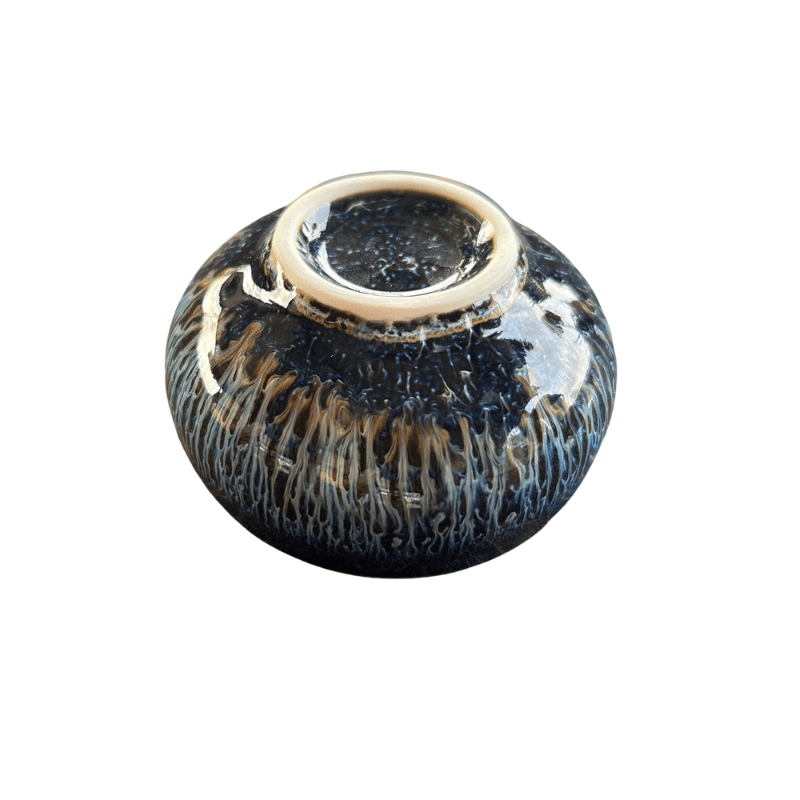 En unik tekop, hvor dybe blå nuancer møder havets stille mystik, og en sølvfarvet fugl hviler i centrum som et symbol på frihed og åndelig opvågning. Glasurens levende spil minder om universets bevægelser – en invitation til fordybelse, nærvær og indre ro.