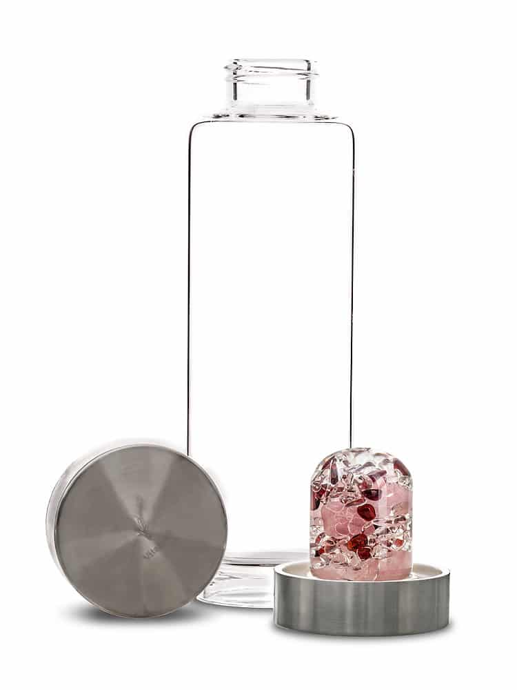 En elegant vandflaske med kærlige energier fra Rosakvarts, Granat og Bjergkrystal.
